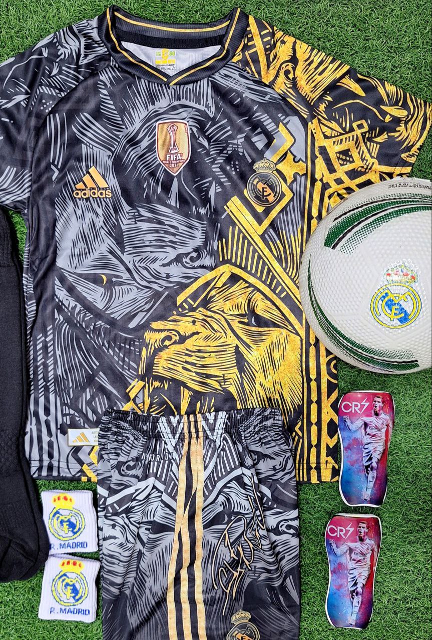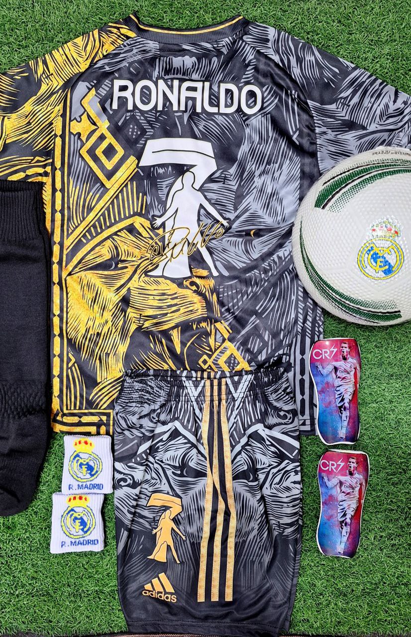 یک دست پیراهن شرت+جوراب+ یک جفت قلم بند +توپ رئال+مچ بند رئال